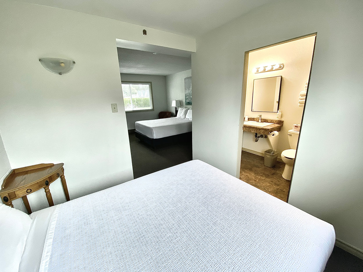 Indulge in a refreshing shower experience with our tub and shower surrounds, equipped with efficient fixtures for ample hot water. Each room is thoughtfully appointed with convenient amenities such as a coffee maker, fridge, microwave, extra pillows, and blankets. For those seeking added flexibility, select rooms feature full kitchens for your culinary needs.
